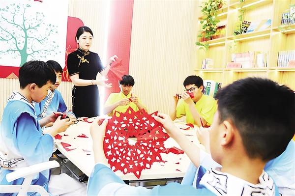 “五一”假期,周口市非物質(zhì)文化遺產(chǎn)剪紙項(xiàng)目代表性傳承人劉秀華(左三)在淮陽伏羲公園的石榴學(xué)堂內(nèi),為學(xué)生講授剪紙知識,既提高了學(xué)生的剪紙水平及欣賞能力,又豐富了他們的假日文化生活。