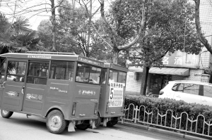 圖④ 七一路西段兩輛“紅頂”三輪車并排停放在快車道上,咱能不能換個安全的地方聊天?!