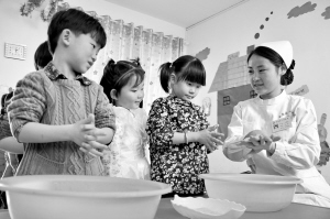4月7日,醫(yī)務(wù)人員在為河北成安縣七色光幼兒園的小朋友講解正確的洗手方式。當(dāng)日是世界衛(wèi)生日,河北省成安縣人民醫(yī)院組織醫(yī)務(wù)人員來到轄區(qū)幼兒園,為小朋友們講解如何正確洗手、刷牙等衛(wèi)生知識(shí),讓他們認(rèn)識(shí)到講衛(wèi)生的重要性,養(yǎng)成良好的衛(wèi)生習(xí)慣。新華社發(fā)