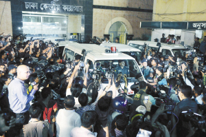 孟加拉國反對黨領(lǐng)導(dǎo)人被執(zhí)行死刑 4月11日,在孟加拉國首都達(dá)卡,人們圍住運送卡馬魯扎曼尸體的救護(hù)車。當(dāng)晚,孟加拉國反對黨伊斯蘭大會黨領(lǐng)導(dǎo)人卡馬魯扎曼在首都達(dá)卡中央監(jiān)獄被執(zhí)行死刑。新華社發(fā)