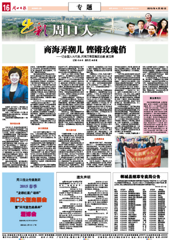 “關于盡快啟動鄭州經周口至合肥快速鐵路前期工作的建議”、“關于完善醫(yī)保制度盡快實施全民免費體檢的建議”、“關于穩(wěn)步推進農房農地抵押擔保的建議”、“切實加大農業(yè)保險投入為現代糧食發(fā)展保駕護航的建議”、“關于建立網絡銷售食品安全追溯機制的建議”、“關于治理電動車‘空中充電’的建議”、“關于盡快構建和完善現代物流業(yè)的法律法規(guī)的建議”……她向市人大、省人大、全國人大累積提出建議30多個,內容涉及農業(yè)、工業(yè)、商業(yè)、法治、金融等10多個行業(yè)。她的許多建議都引起了高層重視,部分建議已經被采納,并得到落實。這每一個建議中,都飽含著她在繁忙工作之余白天調研考察、夜晚燈下奮筆疾書的心血,都體現著她對社會、對人民、對國家的忠誠和關愛。