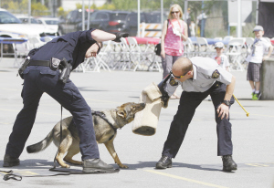 加拿大迎來全國警察周 5月9日, 在加拿大溫哥華地區(qū)的素里市,警察在警局開放日活動(dòng)上向民眾示范警犬訓(xùn)練情況。為迎接一年一度的全國警察周,素里市皇家騎警總部當(dāng)日舉辦開放日活動(dòng),向民眾展示警方裝備及介紹警隊(duì)日常工作。新華社發(fā)