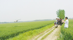 5月7日,一架小型直升機(jī)為小麥噴灑農(nóng)藥。當(dāng)前,正是小麥 “一噴三防”的關(guān)鍵時期,項城市三店鎮(zhèn)多方聯(lián)系,引進(jìn)小型直升機(jī)為小麥高產(chǎn)示范田噴灑農(nóng)藥,為豐產(chǎn)豐收奠定良好基礎(chǔ)。董方靈 攝