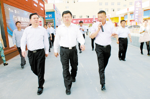 周口市委書記、市人大常委會(huì)主任徐光(中)一行在項(xiàng)城市委書記黃真?zhèn)ィㄗ螅┑呐阃掠^摩項(xiàng)目建設(shè)。