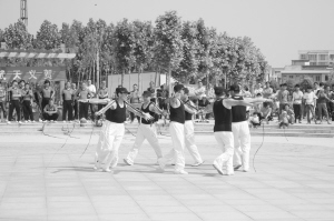 為進(jìn)一步推動(dòng)全民健身活動(dòng)的深入開展,項(xiàng)城市啟動(dòng)了“全民健身月”活動(dòng),讓市民積極投身到全民健身行列中,努力使體育鍛煉經(jīng)常化、個(gè)人健身生活化。圖為5月18日項(xiàng)城市鞭陀協(xié)會(huì)的會(huì)員正在進(jìn)行鞭陀健身展演。
