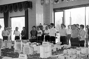 羅文閣在商務(wù)中心區(qū)規(guī)劃沙盤前聽(tīng)取項(xiàng)目進(jìn)展情況匯報(bào)。丁宇濤 攝